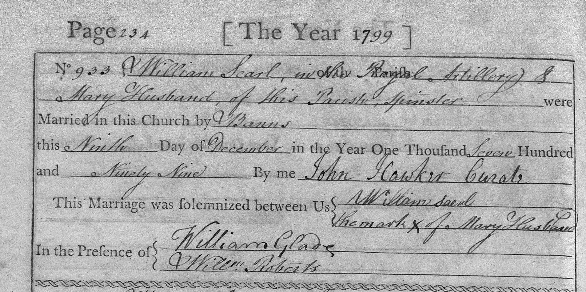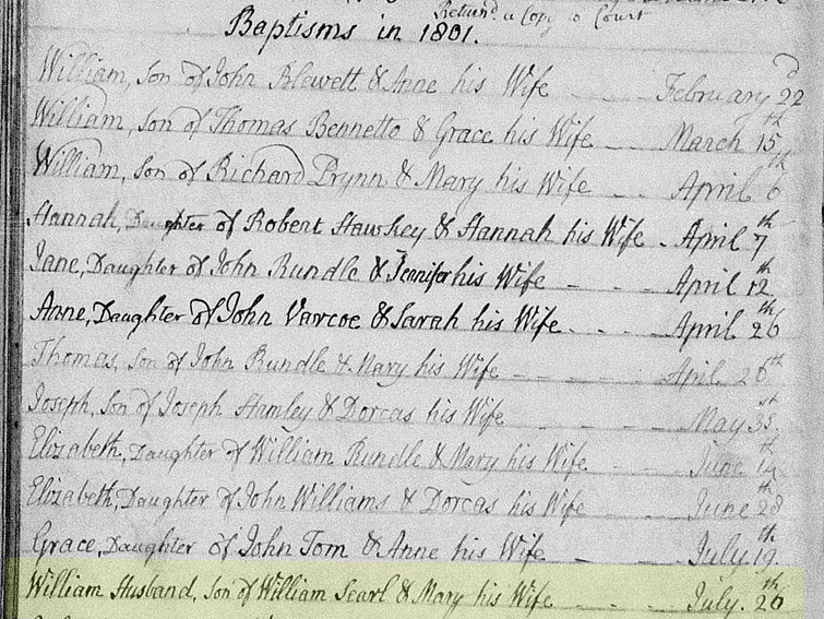 The parents of Arthur's great grandfather, William Husband Searle, are likely accurate, however, there is no record specifically linking William Husband Searle to them; linking William Husband Searle to William Searl and Mary Husband requires some logical reasoning and educated guessing. It appears that for some English families, they chose to include the mother’s maiden name as a middle name for some of their children. Husband is not a very common English first or middle name; therefore, it is likely that the maiden name of William Husband Searle’s mother is Husband. There are no marriage records in Cornwall at all between a Searle and Husband anywhere near the time of William Husband Searle’s baptism. In Stoke Damerel, Devon, which is about 38km east of Tywardreath, where Mary Husband was baptised, there is a marriage record of William Searl and Mary Husband. In 1801, the baptism record of “William Husband, son of William Searl and Mary his wife”, appears in the parish registers of Tywardreath. Given that William Searl is listed as being in the Royal Artillery on the marriage record, there’s a good chance that while William was away serving in the Royal Artillery, Mary lived with her family in Tywardreath and gave birth to William Husband Searle. Tywardreath is also only about 7.25km to the east of St. Austell, where all the likely ancestors of William Searl were located. Lanreath, where William and Mary have their last four children and are buried, is 10km east of Tywardreath. All this information helps establish a likely ancestral link from the son to his parents, however, it cannot be proven with 100% accuracy from the available sources.