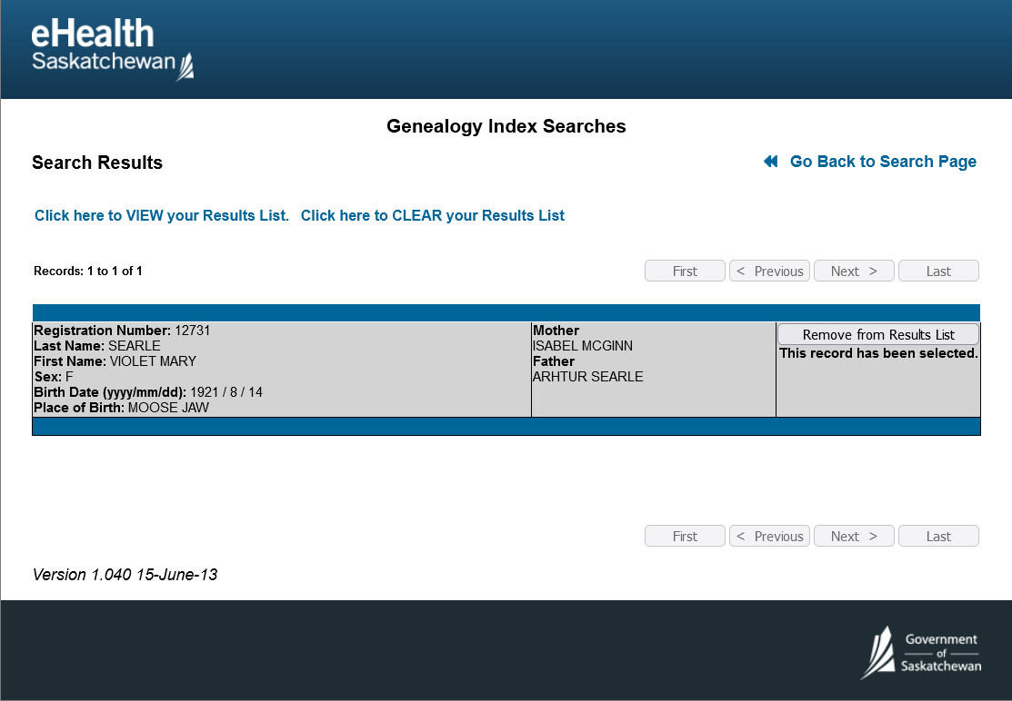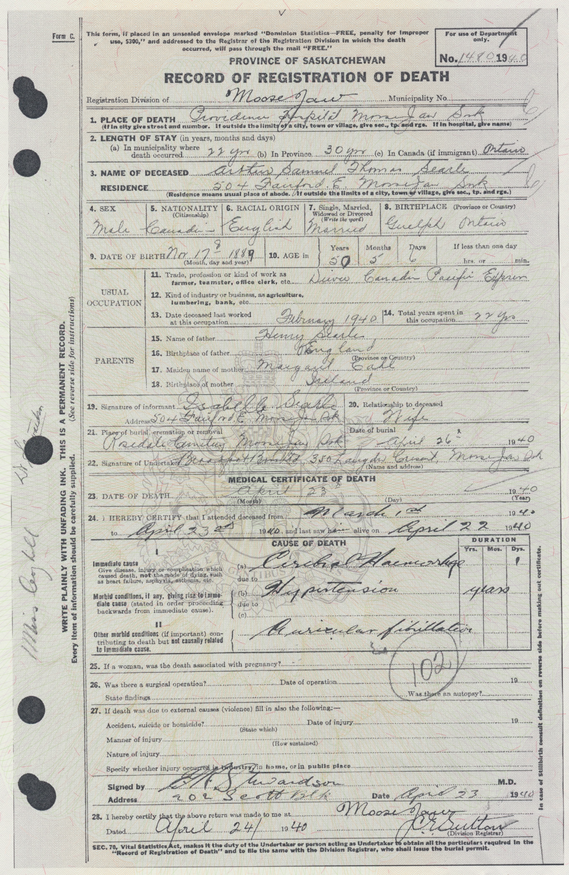 Burial: 25 April 1940 in the Rosedale Cemetery, Moose Jaw, Saskatchewan, Canada