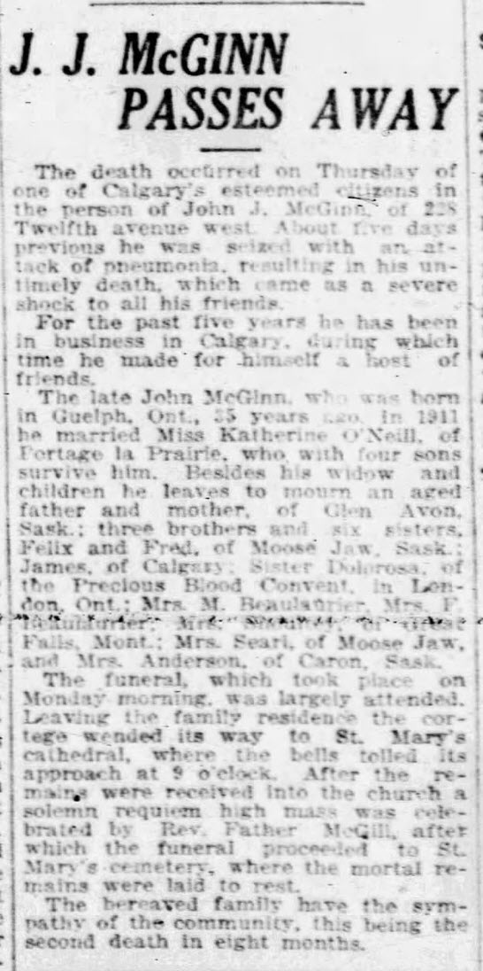 "The death occurred on Thursday of one of Calgary's esteemed citizens in the person of John J. McGinn, of 228 Twelfth avenue west. About five days previous he was seized with an attack of pneumonia, resulting in his untimely death, which came as a severe shock to all his friends. For the past five years he has been in business in Calgary, during which time he made for himself a host of friends. The late John McGinn, who was born in Guelph, Ont., 35 years ago. In 1911 he married Miss Katherine O'Neill, of Portage la Prairie, who with four sons survive him. Besides his widow and children he leaves to mourn an aged father and mother, of Glen Avon, Sask.; three brothers and six sisters, Felix and Fred, of Moose Jaw, Sask.; James, of Calgary; Sister Dolorosa, of the Precious Blood Convent, in London, Ont; Mrs. M. Beaulaurier, Mrs. F. Beaulaurier; Mrs. [Schulte}, of Great Falls, Mont.; Mrs. Searl, of Moose Jaw, and Mrs. Anderson, of Caron, Sask. The funeral, which took place on Monday morning, was largely attended. Leaving the family residence the cortege wended its way to St. Mary's cathedral, where the bells tolled its approach at 9 o'clock. After the remains were received into the church a solemn requiem high mass was celebrated by Rev. Father McGill, after which the funeral proceeded to St. Mary's cemetery, where the mortal remains were laid to rest. The bereaved family have the sympathy of the community, this being the second death in eight months."