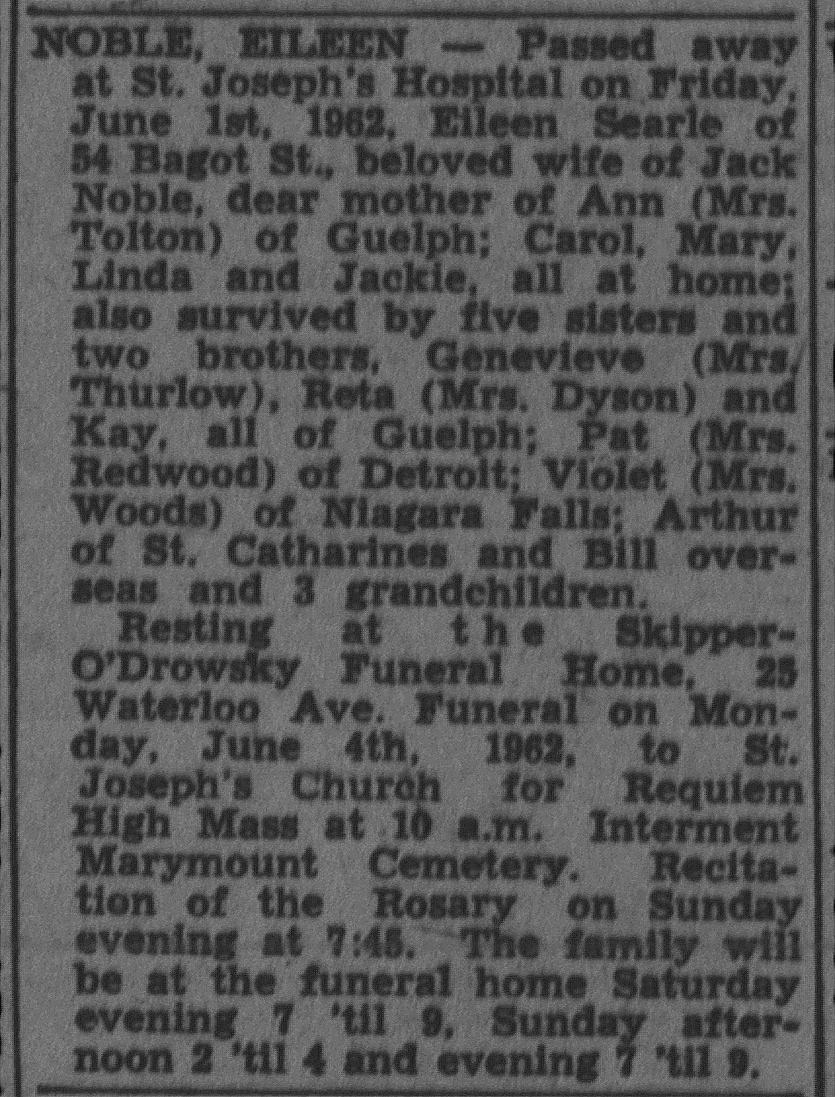 "Passed away at St. Joseph's Hospital on Friday, June 1st, 1962. Eileen Searle of 54 Bagot St., beloved wife of Jack Noble, dear mother of Ann (Mrs. Tolton) of Guelph; Carol, Mary, Linda and Jackie, all at home; also survived by five sisters and two brothers, Genevieve (Mrs. Thurlow), Reta (Mrs. Dyson) and Kay, all of Guelph; Pat (Mrs. Redwood) of Detroit; Violet (Mrs. Woods) of Niagara Falls; Arthur of St. Catharines and Bill overseas and 3 grandchildren. Resting at the Skipper-O'Drowsky Funeral Home, 25 Waterloo Ave. Funeral on Monday, June 4th, 1962, to St. Joseph's Church for Requiem High Mass at 10 a.m. Interment Marymount Cemetery. Recitation of the Rosary on Sunday evening at 7:45. The family will be at the funeral home Saturday evening 7 'til 9, Sunday afternoon 2 'til 4 and evening 7 'til 9."