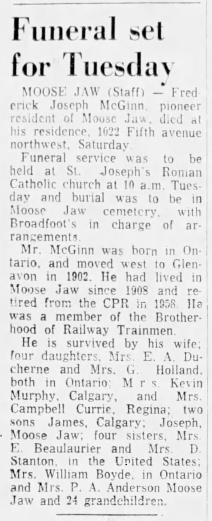 "MOOSE JAW (Staff) - Frederick Joseph McGinn, pioneer resident of Moose Jaw, died at his residence, 1022 Fifth avenue northwest, Saturday. Funeral service was to be held at St. Joseph's Roman Catholic church at 10 a.m. Tuesday and burial was to be in Moose Jaw cemetery, with Broadfoot's in charge of arrangements. Mr. McGinn was born in Ontario, and moved west to Glenavon in 1902. He had lived in Moose Jaw since 1908 and retired from the CPR in 1958. He was a member of the Brotherhood of Railway Trainmen. He is survived by his wife; four daughters, Mrs. E. A. Ducherne and Mrs. G. Holland, both in Ontario; Mrs. Kevin Murphy, Calgary, and Mrs. Campbell Currie, Regina; two sons James, Calgary; Joseph, Moose Jaw; four sisters, Mrs. E. Beaulaurier and Mrs. D. Stanton, in the United States; Mrs. William Boyde, in Ontario and Mrs. P. A. Anderson Moose Jaw and 24 grandchildren."