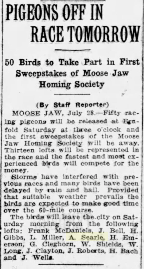 "MOOSE JAW, July 28 - Fifty racing pigeons will be released at Ernfold Saturday at three o'clock and the first sweepstakes of the Moose Jaw Homing Society will be away. Thirteen lofts will be represented in the race and the fastest and most experienced birds will compete for the money. Storms have interfered with previous races and many birds have been delayed by rain and hail. Provided that suitable weather prevails the birds are expected to make good time over the 60-mile course. The birds will leave the city on Saturday morning from the following lofts: Frank McDaniels, J. Bell, H. Gibbs, L. Miller, A. Searle, H. Emerson, G. Cleghorn, W. Shields, W. Long, J. Clayton, J. Roberts, H. Bach and J. Wells."