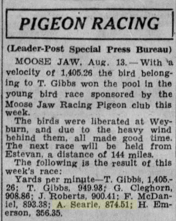 "MOOSE JAW, Aug. 13 - With a velocity of 1,405.26 the bird belonging to T. Gibbs won the pool in the young bird race sponsored by the Moose Jaw Racing Pigeon club this week. The birds were liberated at Weyburn, and due to the heavy wind behind them, all made good time. The next race will be held from Estevan, a distance of 144 miles. The following is the result of this week's race: Yards per minute - T. Gibbs, 1,4505.26; T. Gibbs, 949.98; G. Cleghorn, 908.86; J. Roberts, 900.41; F. McDaniel, 893.38; A. Searle, 874.51; H. Emerson, 356.35."