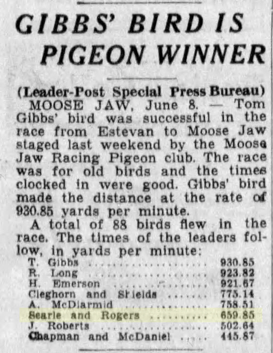 "MOOSE JAW, June 8 - Tom Gibbs' bird was successful in the race from Estevan to Moose Jaw staged last weekend by the Moose Jaw Racing Pigeon club. The race was for old birds and the times clocked in were good. Gibbs' bird made the distance at the rate of 930.85 yards per minute. A total of 88 birds flew in the race. The times of the leaders follow, in yards per minute: T. Gibbs, 930.85; R. Long, 923.82; H. Emerson, 921.67; Cleghorn and Shields, 775.14; A. McDiarmid, 758.51; Searle and Rogers, 659.85; J. Roberts, 502.64; Chapman and McDaniel, 445.87."