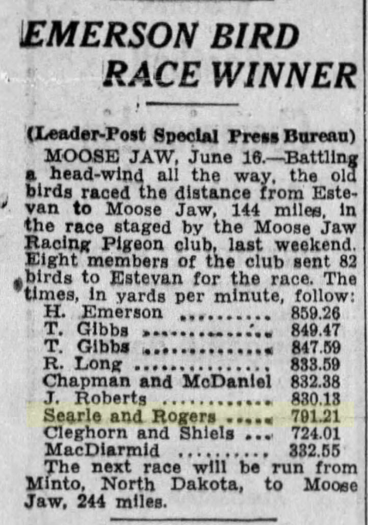 "MOOSE JAW, July 21 - Birds owned by the Moose Jaw Racing Pigeon club, flew into storms last weekend in the race from Hankinson, N.D., to Moose Jaw, a distance of 511 miles. In view of the difficulties the birds did not make very good time. The times in yards per minute follow: T. Gibbs, 682.47; Roberts, 659.72; Searle and Rogers, 658.72; Roberts, 564.25; Emerson, 515.19; Cleghorn and Shields, 502.81."