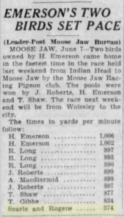 "MOOSE JAW, June 7 - Two birds owned by H. Emerson came home in the fastest time in the race held last weekend from Indian Head to Moose Jaw by the Moose Jaw Racing Pigeon club. The pools were won by J. Roberts, H. Emerson and T. Shaw. The race next weekend will be from Wolseley to the city. The times in yards per minute follow: H. Emerson, 1,006; H. Emerson, 1,002; R. Long, 997; R. Long, 993; R. Long, 990; J. Roberts, 899; A. MacDiarmid, 898; J. Roberts, 897; T. Shaw, 877; T. Gibbs, 834; Searle and Rogers, 574."