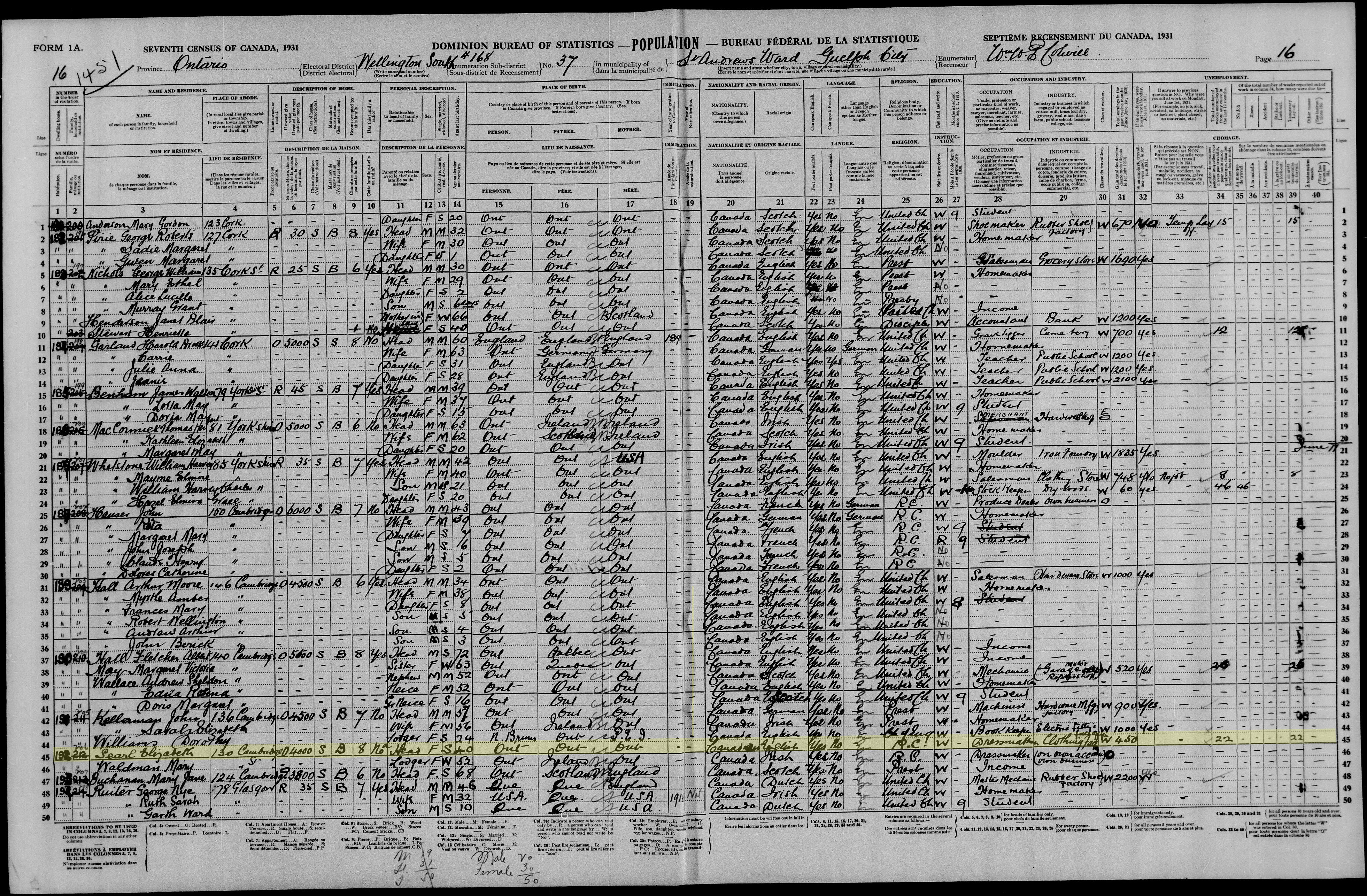 "Death came to Miss Elizabeth Searle, 130 Cambridge Street, Sunday evening at St. Joseph's hospital where she had been ill for a short time. The daughter of the late Henry Searle and Margaret Cahill, she was born in Puslinch township. For ten years she lived in Elora where she operated a dressmaking shop. During the last twenty years Miss Searle had been a resident of this city. She attended the Church of Our Lady and was a member of the Confraternity of the Holy Family. Surviving are three brothers, Joseph, Guelph Township; William of this city; and Harry, Mortlach, Sask.; and two sisters, Mrs. Joseph McCann, Hillsburg; and Miss Maude Searle, Guelph Township. Fourteen nieces and twelve nephews also survive. Remains are resting at her late residence, 130 Cambridge Street. The funeral will be held tomorrow at the Church of Our Lady, when Requiem High Mass will be celebrated at ten o'clock. Interment will be made in St. Joseph's Cemetery."