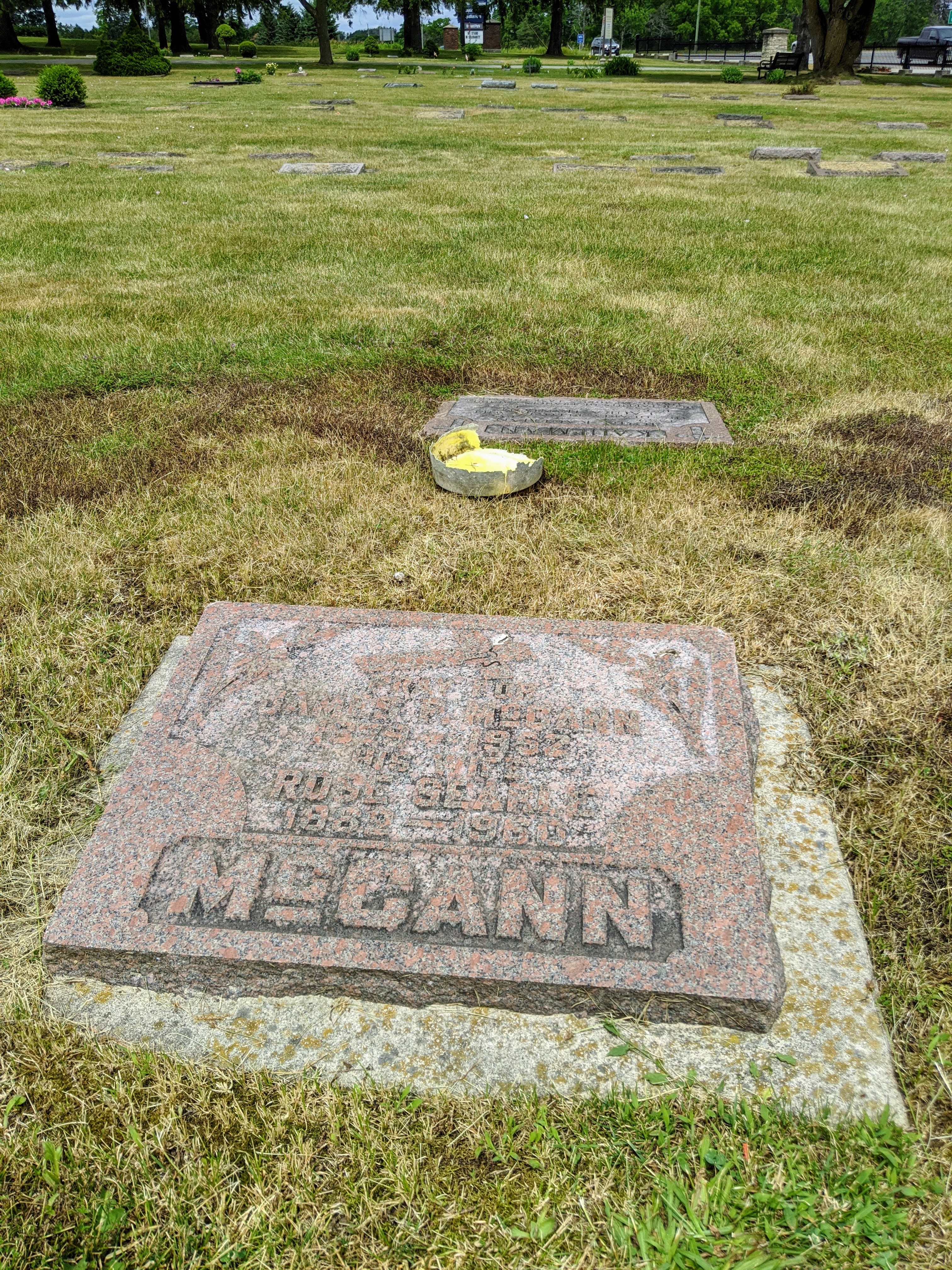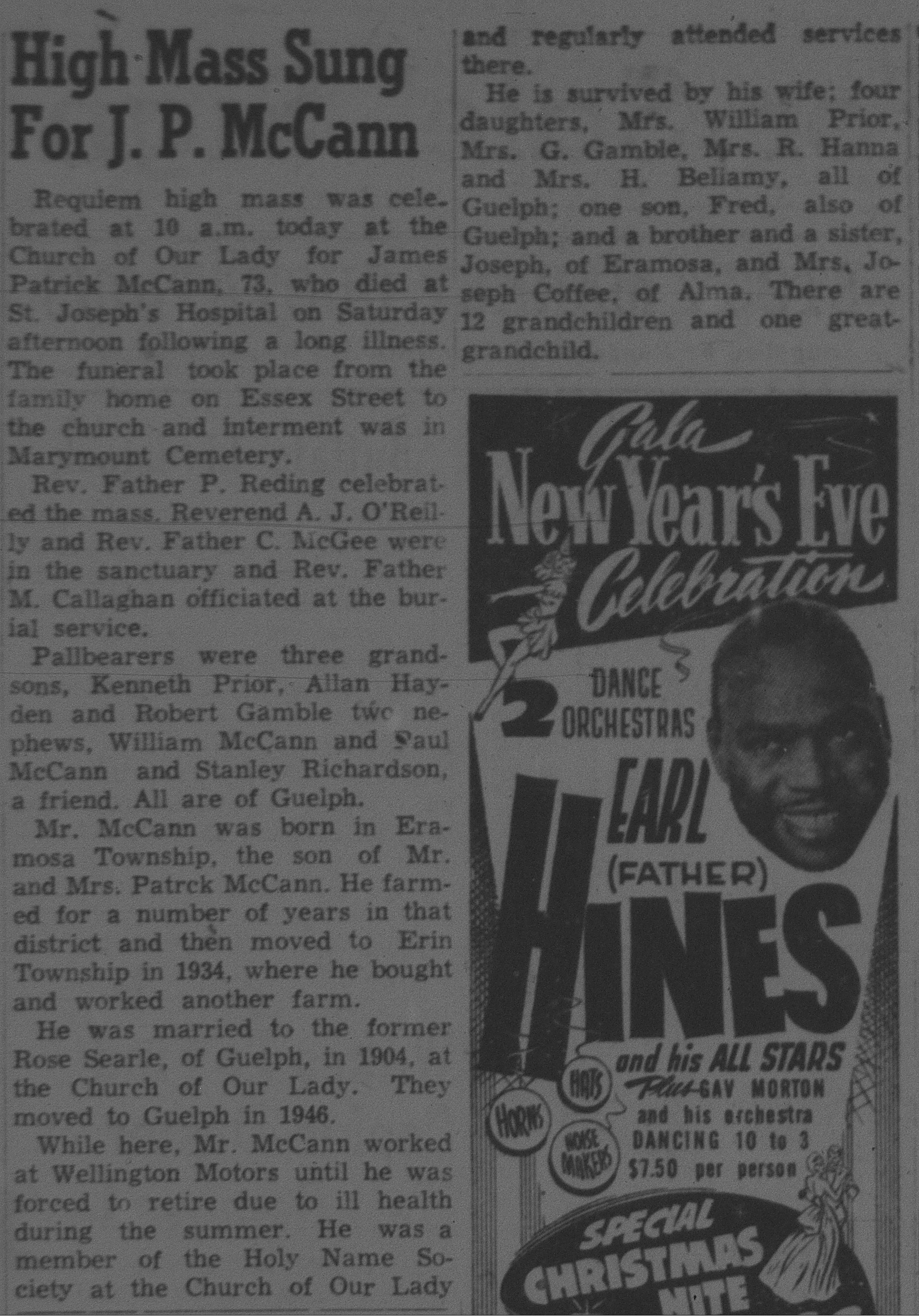 "Requiem high mass was celebrated at 10 a.m. today at the Church of Our Lady for James Patrick McCann, 73, who died at St. Joseph's Hospital on Saturday afternoon following a long illness. The funeral took place from the family home on Essex Street to the church and interment was in Marymount Cemetery. Rev. Father P. Reding celebrated the mass. Reverend A. J. O'Reilly and Rev. Father C. McGee were in the sanctuary and Rev. Father M. Callaghan officiated at the burial services. Pallbearers were three grandsons, Kenneth Prior, Allan Hayden and Robert Gamble two nephews, William McCann and Paul McCann and Stanley Richardson, a friend. All are of Guelph. Mr. McCann was born in Eramosa Township, the son of Mr. and Mrs. Patrick McCann. He farmed for a number of years in that district and then moved to Erin Township in 1934, where he bought and worked another farm. He was married to the former Rose Searle, of Guelph, in 1904, at the Church of Our Lady. They moved to Guelph in 1946. While here, Mr. McCann worked at Wellington Motors until he was forced to retire due to ill health during the summer. He was a member of the Holy Name Society at the Church of Our Lady and regularly attended services there. He is survived by his wife; four daughters, Mrs. William Prior, Mrs. G. Gamble, Mrs. R. Hanna and Mrs. H. Bellamy, all of Guelph; one son, Fred, also of Guelph; and a brother and a sister, Joseph, of Eramosa, and Mrs. Joseph Coffee, of Alma. There are 12 grandchildren and one great-grandchild."