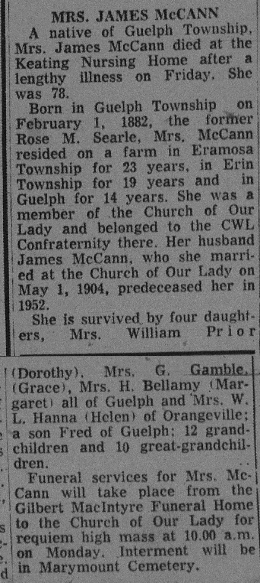 "A native of Guelph Township, Mrs. James McCann died at the Keating Nursing Home after a lengthy illness on Friday. She was 78. Born in Guelph Township on February 1, 1882, the former Rose M. Searle, Mrs. McCann resided on a farm in Eramosa Township for 23 years, in Erin Township for 19 years and in Guelph for 14 years. She was a member of the Church of Our Lady and belonged to the CWL Confraternity there. Her husband James McCann, who she married at the Church of Our Lady on May 1, 1904, predeceased her in 1952. She is survived by four daughters, Mrs. William Prior (Dorothy), Mrs. G. Gamble (Grace), Mrs. H. Bellamy (Margaret) all of Guelph and Mrs. W. L. Hanna (Helen) of Orangeville; a son Fred of Guelph; 12 grandchildren and 10 great-grandchildren. Funeral services for Mrs. McCann will take place from the Gilbert MacIntyre Funeral Home to the Church of Our Lady for requiem high mass at 10:00 a.m. on Monday. Interment will be in Marymount Cemetery."